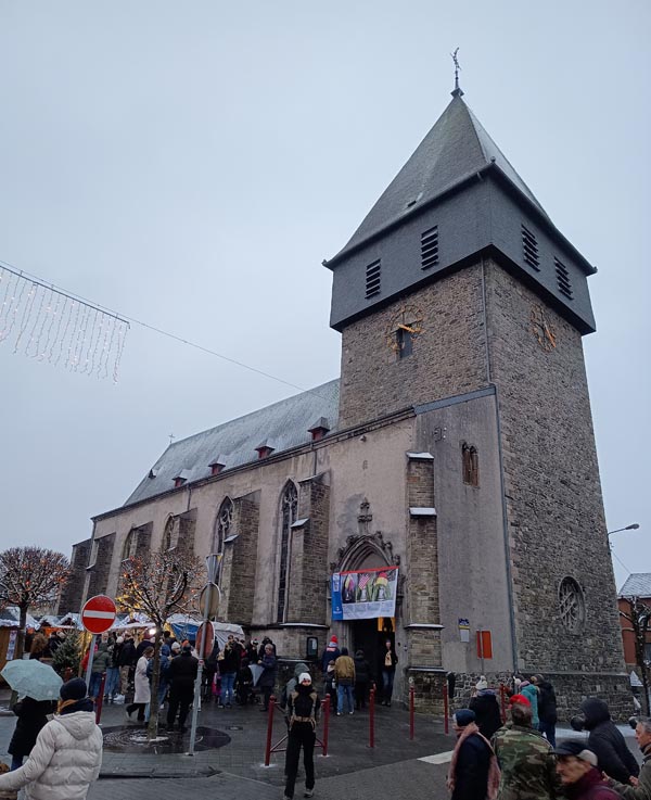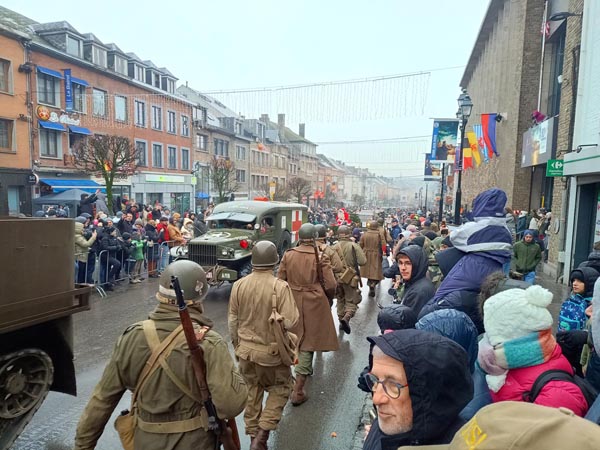 ![]() Tijdens het Nutsweekend is er op zondagmiddag een parade van militaire voertuigen uit WW2 door de hoofdstraat van Bastogne; Rue de Sablon. In 2024 werd er rond 15:15 ook met walnoten gestrooid vanaf het balkon van het stadshuis, op deze foto rechtsboven. (december 2024)