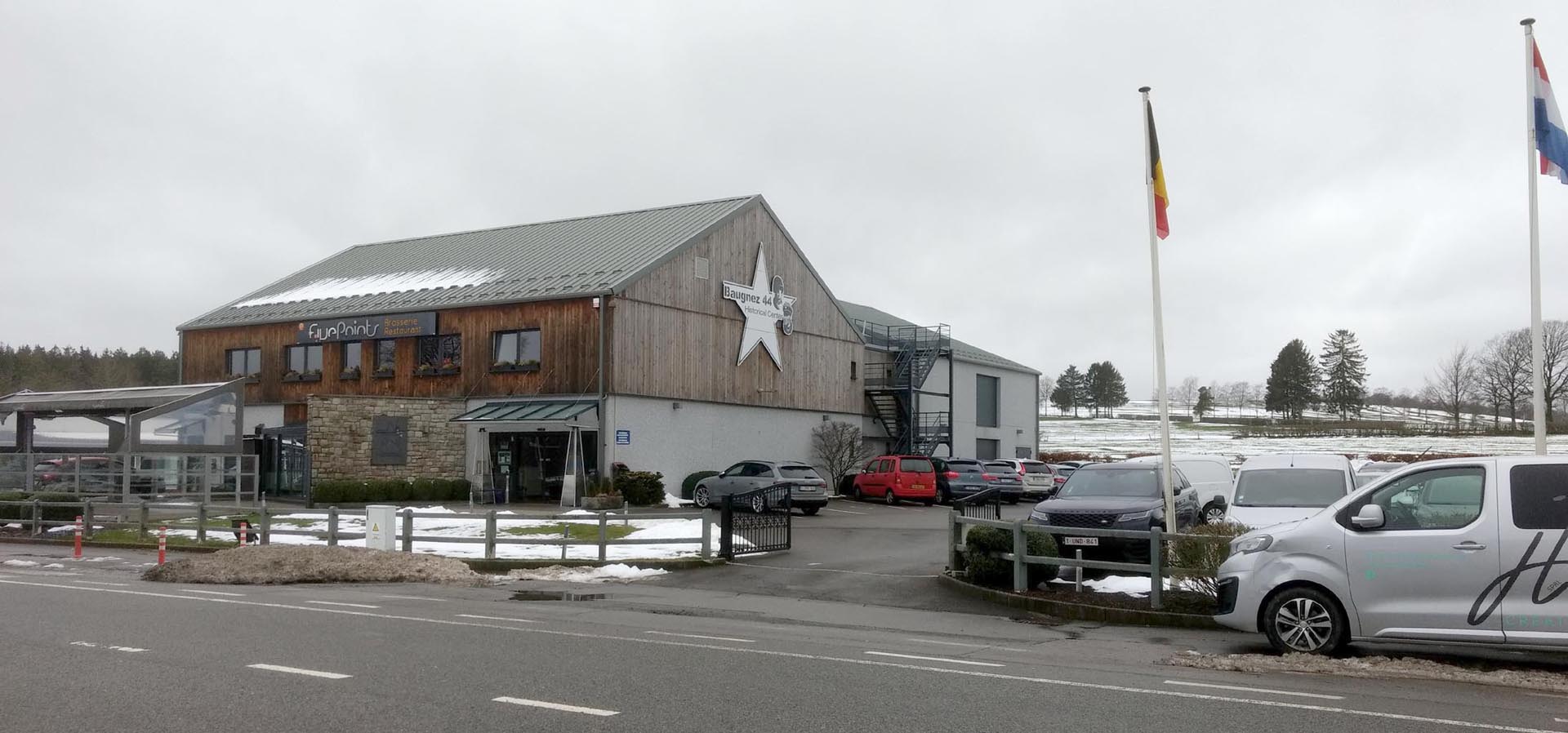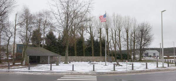 Links het Massacre Memorial en helemaal rechts nog net een stuk woonhuis waar destijds café Bodarwé stond. Links van dit woonhuis staat in de verte een gebouw waar op deze foto een groot gedeelte van een witte ster te zien is, dit was tot 2023 het museum "Baugnez 44 Historical Center".