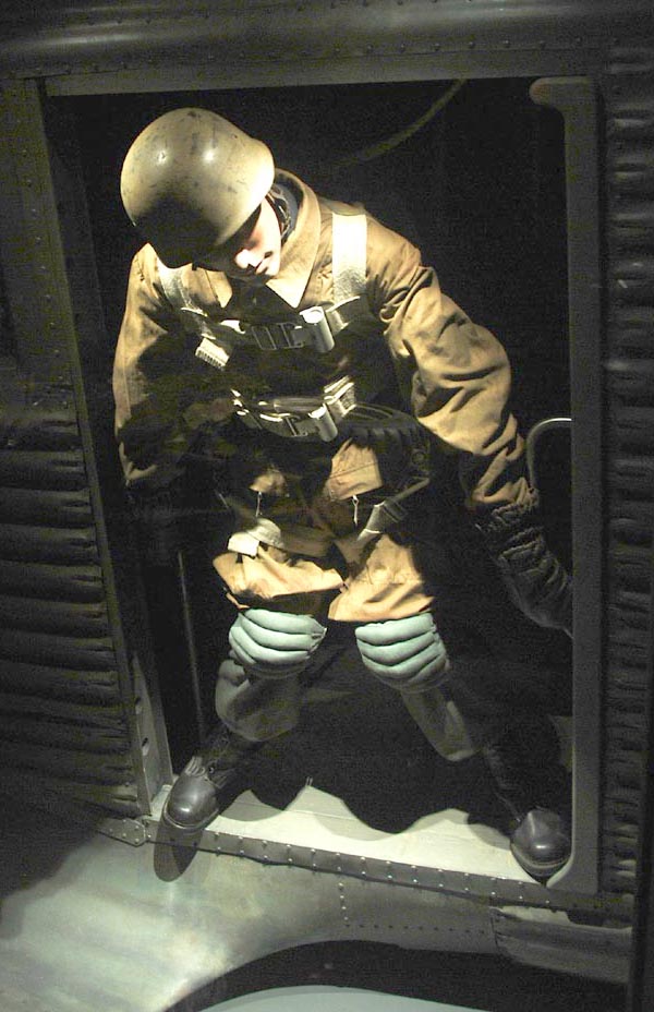 Een duitse valschermjager in het kattenluikje van een tante Ju