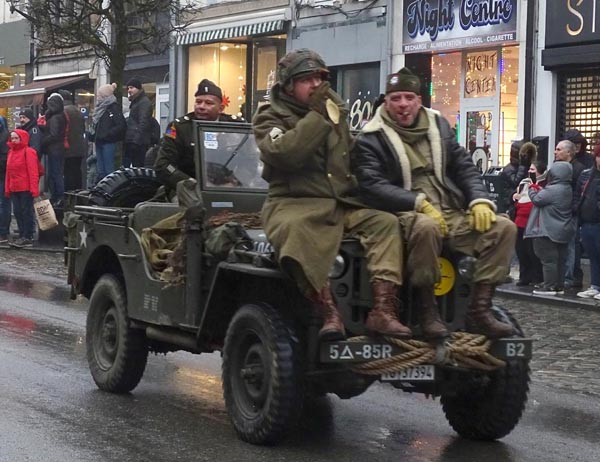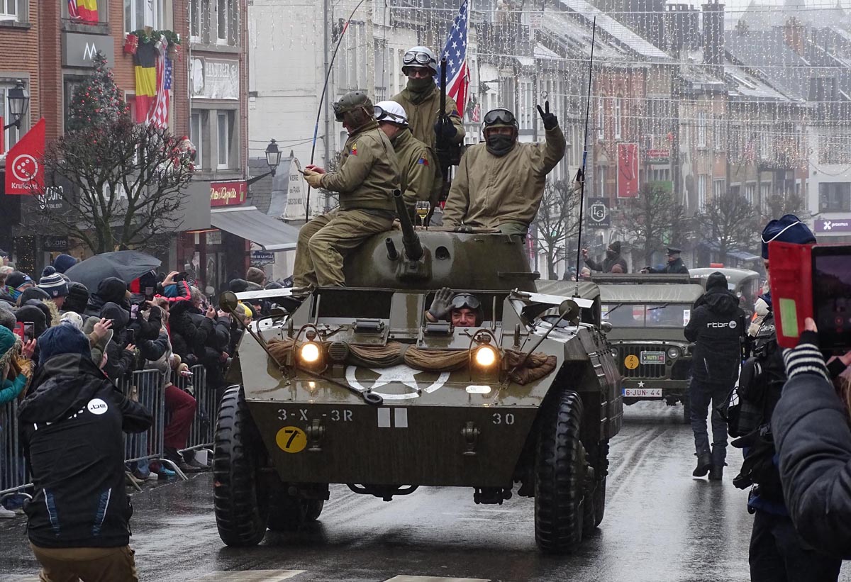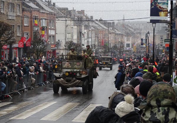 Parade van historische voertuigen door de hoofdstraat van Bastogne