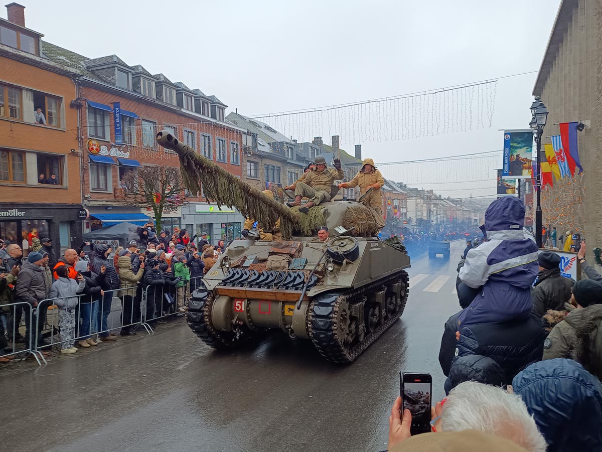 Sherman Buccaneer door de Rue de Sablon in Bastogne, zondagmiddag 15 december 2024.