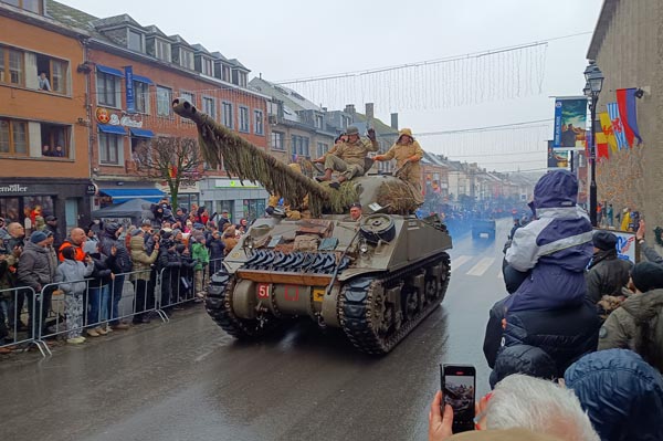 Sherman Buccaneer door de Rue de Sablon in Bastogne, zondagmiddag 15 december 2024.